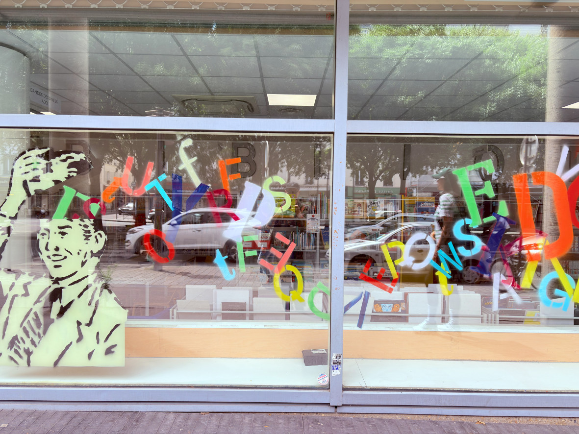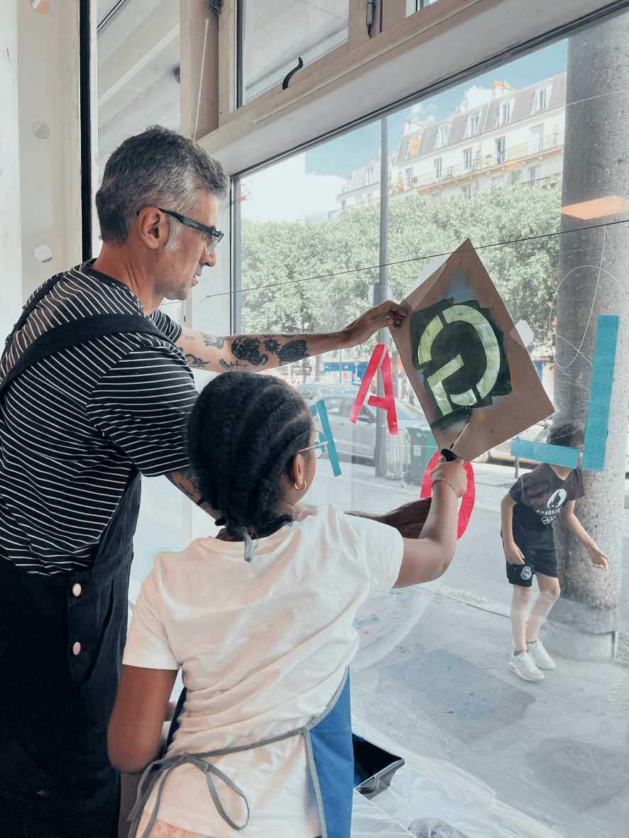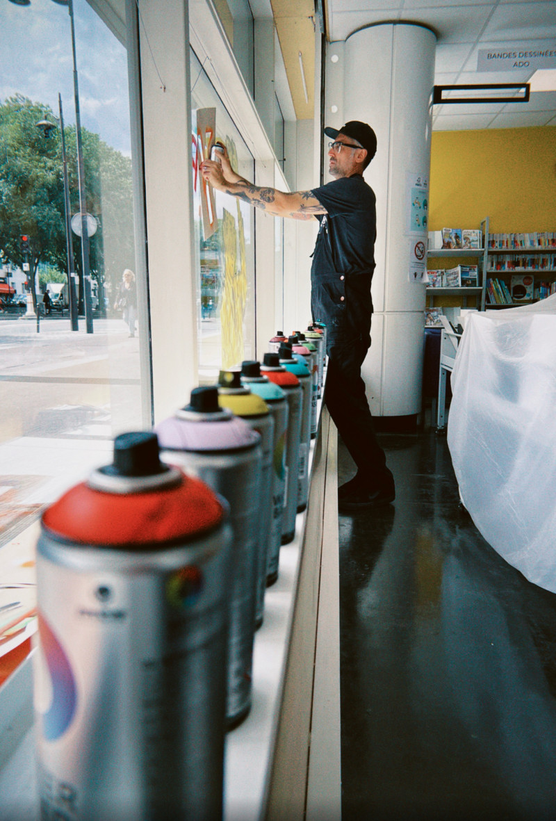 Nesse contexto, o ponto central do projeto foi o mural desenvolvido na fachada da Biblioteca Benjamin Rabier, um espaço voltado à infância e juventude. O trabalho não se limitou à execução pictórica: envolveu encontros e ações participativas, incluindo uma oficina de stencil com crianças, que também intervieram na vitrine da biblioteca. A experiência reafirma um princípio que guia minha trajetória: a arte pública como espaço de encontro e construção coletiva.
