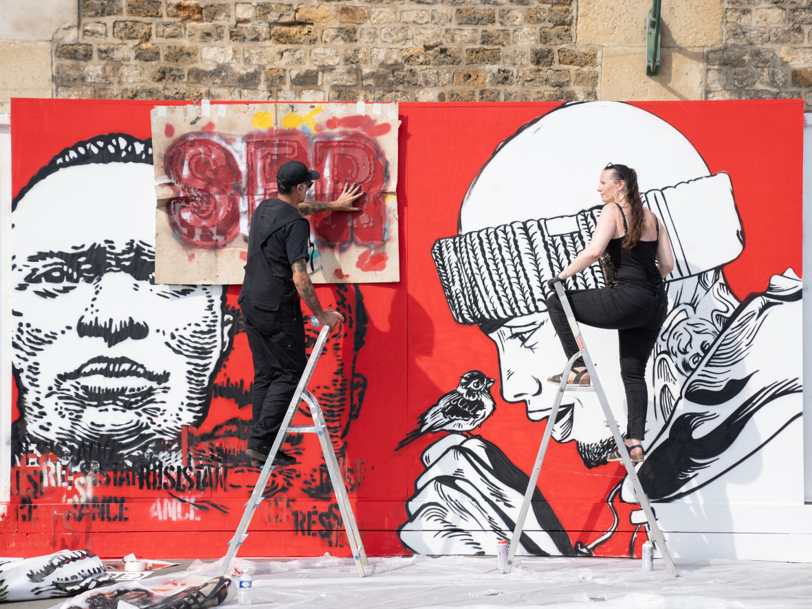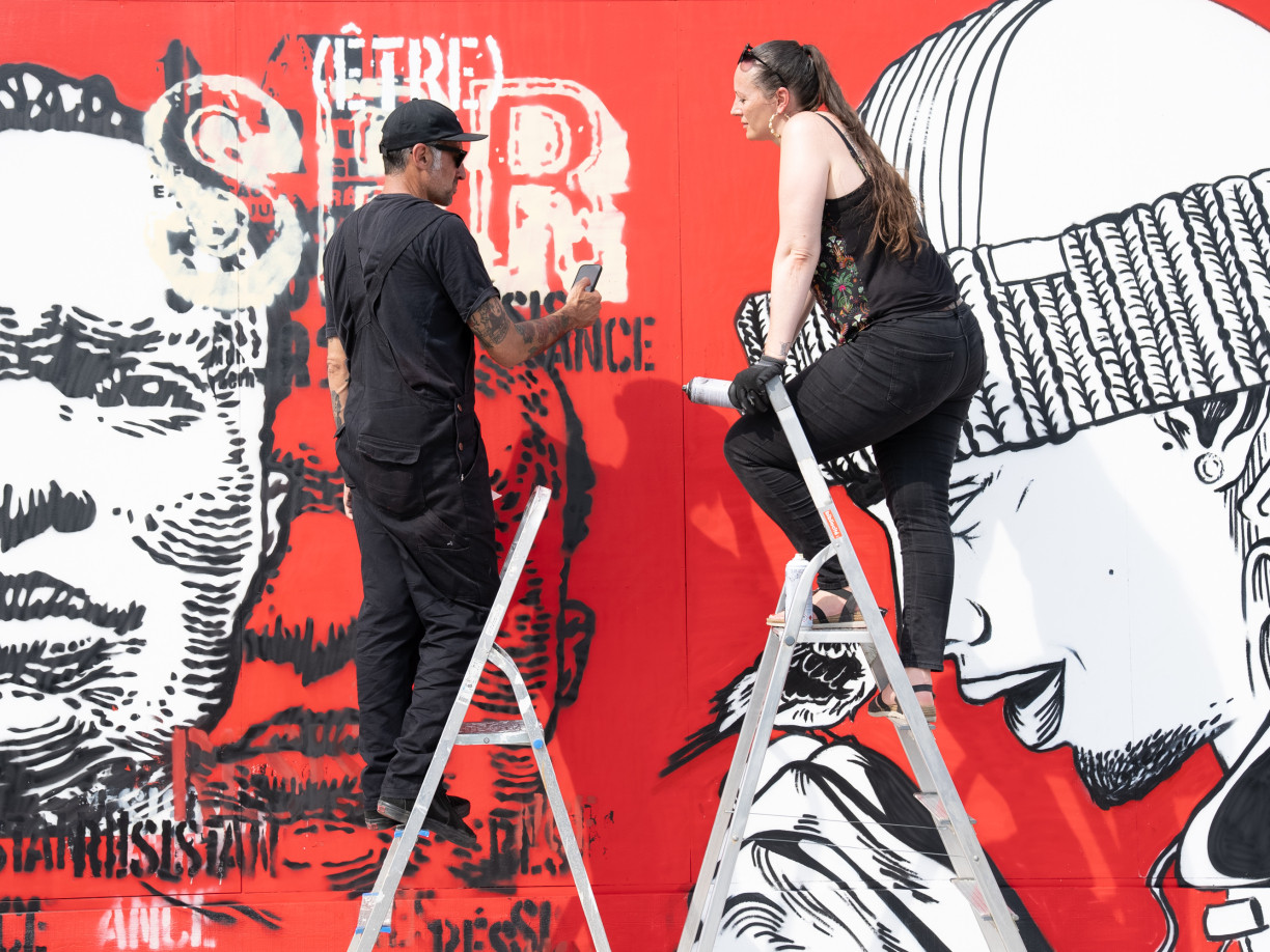 Durante a residência, realizei uma investigação sobre memória gráfica, tipografia e iconografia política, que incluiu visitas à Librairie Publico, espaço histórico vinculado à Federação Anarquista, e à Biblioteca Nacional da França, com acesso a acervos que guardam cartazes, livros e documentos fundamentais para a compreensão das linguagens visuais associadas às lutas sociais. Essa pesquisa não é um apêndice ao mural – ela fundamenta escolhas cromáticas, compositivas e discursivas presentes na obra.