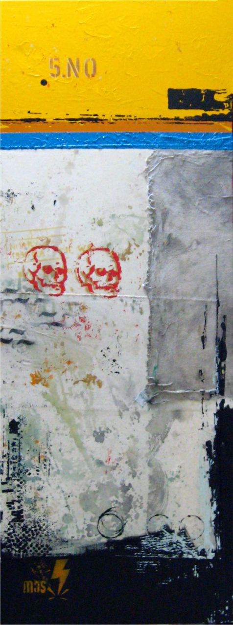 Acrilic paint, latex emulsion, spray an collage on canvas